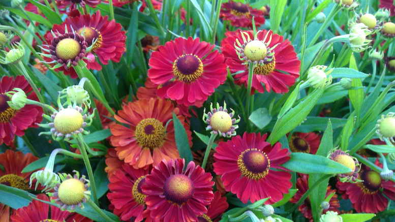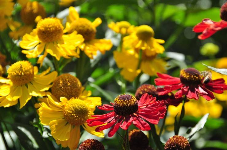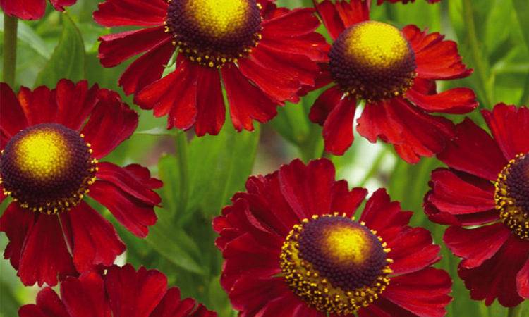 - хибрид хелениум. Културата достига 1-1,3 м височина. Сортовете се различават в различни нюанси: от светло жълто до наситено бордо. Те достигат 3 см в диаметър. Обилен цъфтеж настъпва през юли;