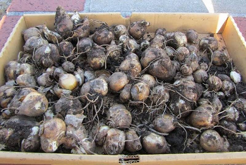 Преди да изпратите луковиците за съхранение, е необходимо да ги дезинфекцирате в слаб разтвор на калиев перманганат. След това изсушете посадъчния материал за една седмица. Не може да се суши на слънце. Най-добре е тази процедура да се извършва в тъмно, сухо помещение при температура от +20 ° C.