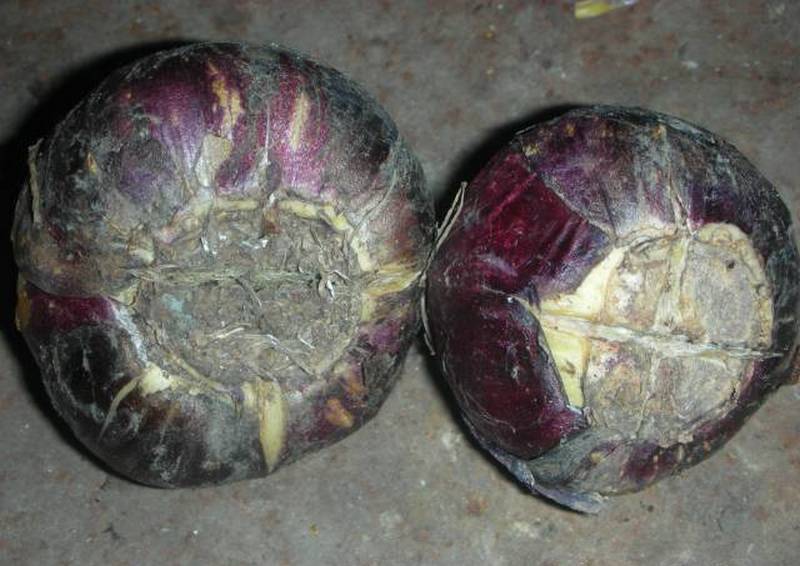 Болните материали се изхвърлят, преди да бъдат изпратени за съхранение. Какво да правя с него? Колкото по-рано се открие заболяването, толкова по-добре. Такива луковици трябва да бъдат обработени в тъмен разтвор на калиев перманганат и да се съхраняват отделно от здрави екземпляри.