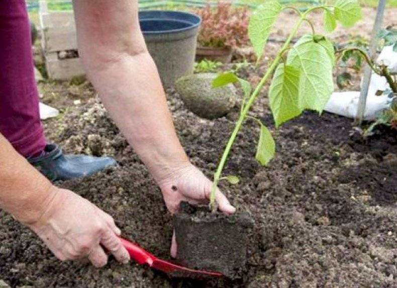 - Корените на разсада се поставят в дупка, поръсват се с пръст и се уплътняват.