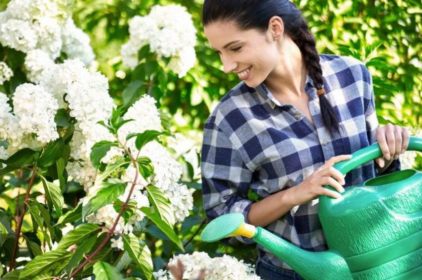 Грижата за хортензиите не е трудна, основното е да направите всичко навреме. Растението обича влагата, поради което е невъзможно да се изсуши почвата на мястото на нейния растеж. Трябва да поливате с леко подкиселена вода. В жегата те се поливат два пъти седмично. Налейте 30-40 литра вода под един храст.