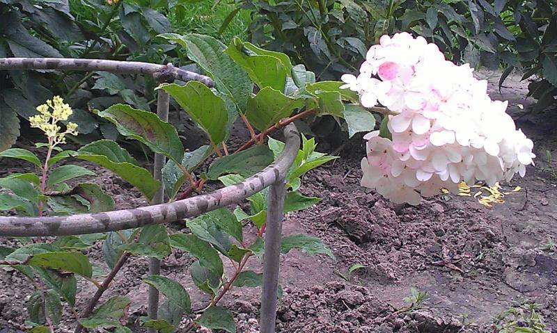 След това задължително поливайте. След това осигурете постоянна влага през горещия сезон. Освен това, веднага след като хортензията е засадена, тя трябва да бъде вързана, за това трябва да подготвите опора, за предпочитане метална.