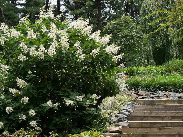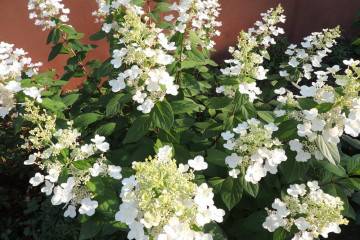 Hydrangea paniculata Tardiva има бели съцветия, които с времето стават червеникави.