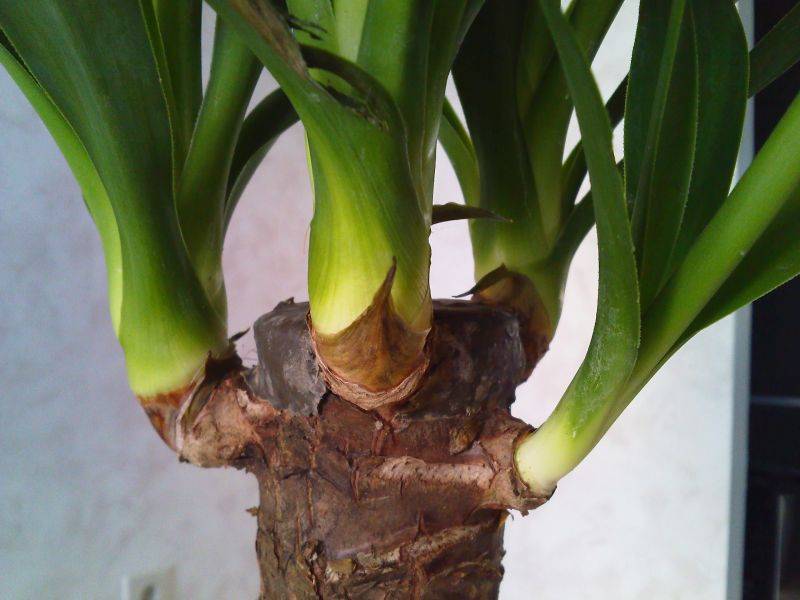 При тези условия младите издънки се появяват върху отрязаната юка след 4-6 седмици. Нови пъпки се излюпват точно под среза.Ако диаметърът на ствола е повече от 5 см, препоръчително е да оставите 2 или 3 издънки от противоположните страни на конопа за покълване, а останалите отстранете с остър дезинфекциран инструмент.