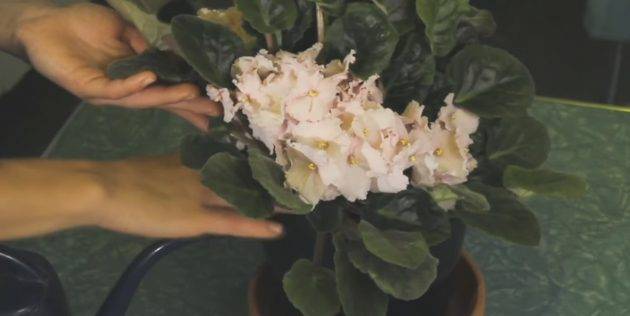 На дъното на саксията трябва да има дупки, които са покрити с експандирана глина и глинени парчета. Водата се излива от лейка в тава с теменужки, след което се долива, когато попадне в саксията. Поливането се спира, когато течността вече не излиза. Трябва да се източи, за да се предотврати загниването на корените.