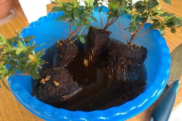 - преди да отрежете азалията, тя се държи 5 часа в стимулатор на растежа на корените. За 1 литър вода ще ви трябват 2 таблетки хетероауксин. Можете също да използвате циркон, но накиснете материала за 24 часа;