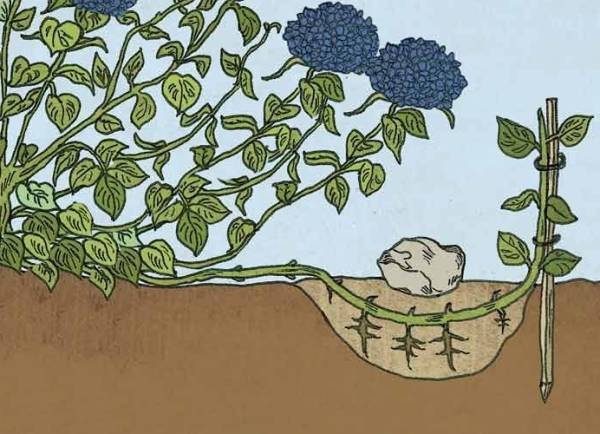 През топлия сезон, храстите на хортензия се изследват, за да се намери бягство, което ще бъде разположено близо до повърхността на почвата. Клонът трябва да е на 10-15 см от земята. Експертите препоръчват да се отрежат всички листни плочи от издънката. Долната част на клона се изчиства от кора, прикрепва се към почвата и се покрива със слой пръст, така че върхът на клона да остане над земята и няколко възела се заравят в почвата.