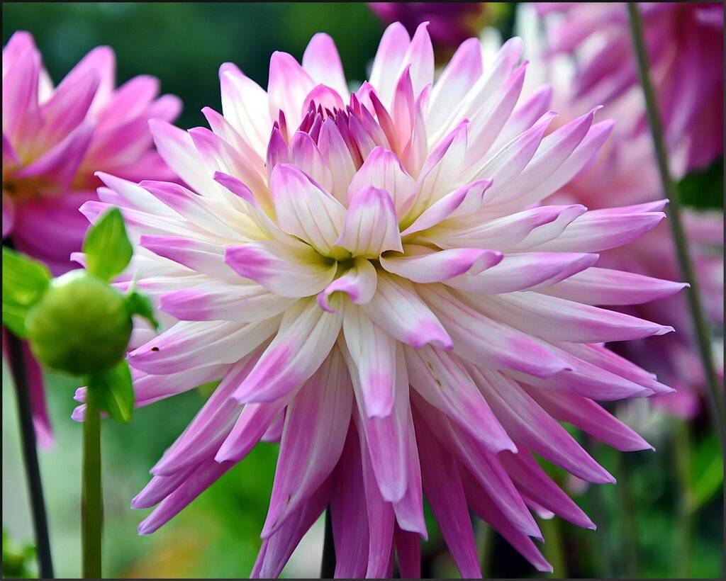 Много красива холандска далия. Храстът расте до 50 см, а розетките могат да бъдат с диаметър над 10 см. Разцъфналите му пъпки съчетават бледорозови и бели нюанси.