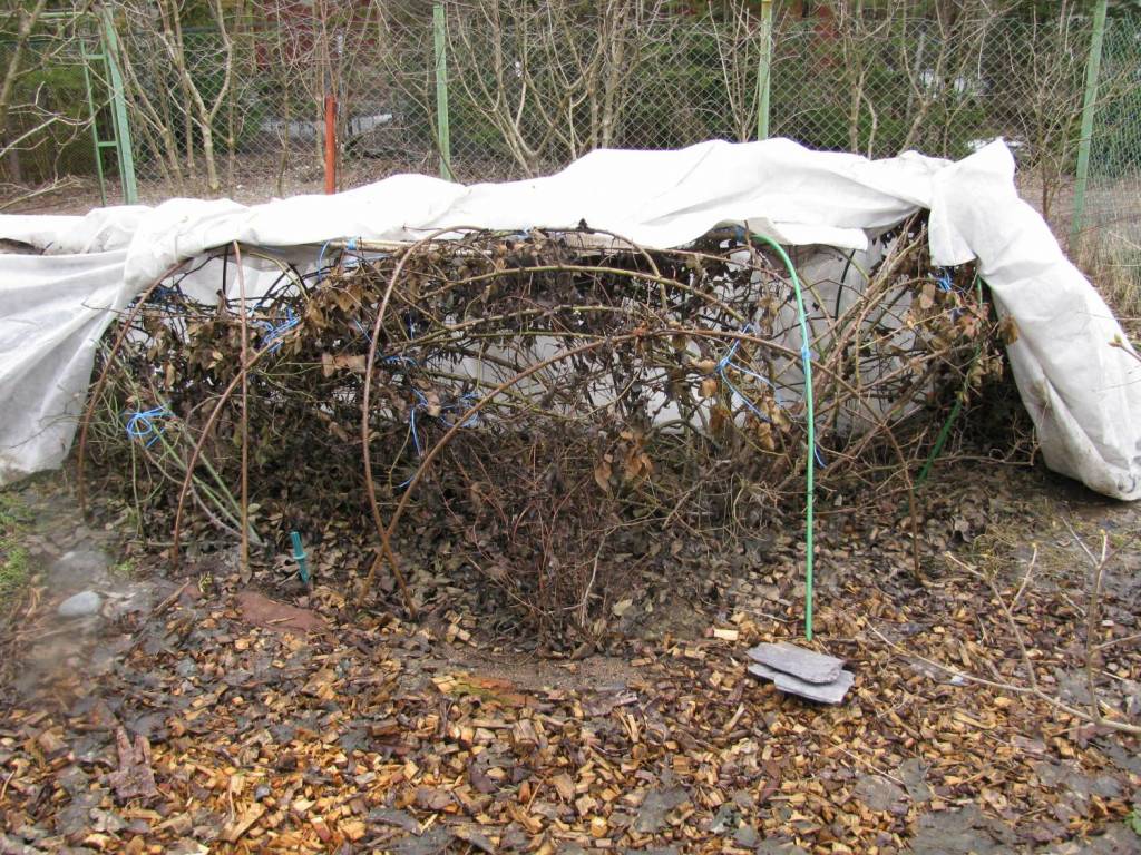 - Почвата се поставя в торба, последвана от подготвените и нарязани клонки.