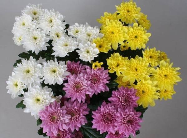 Съцветията на хризантемата са кошници, в които може да има до хиляда тръбести цветя. Техните нюанси могат да бъдат различни, има бургундски, розови, жълти и люлякови цветя.