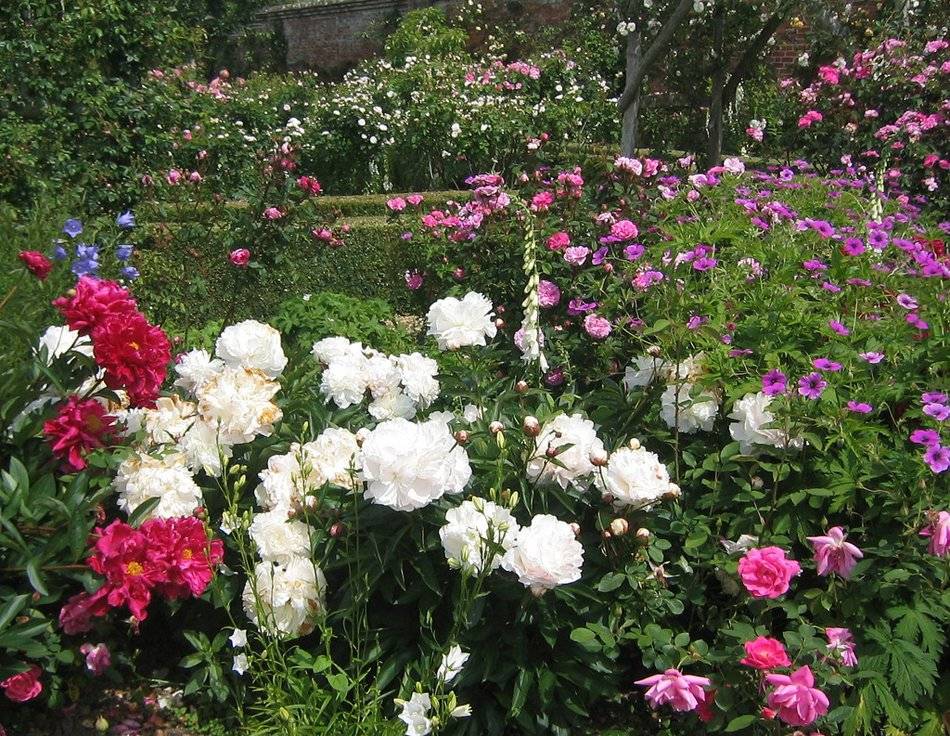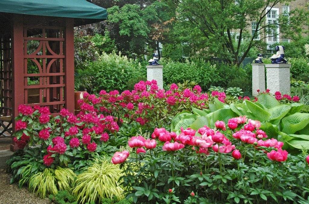 В този случай можете да използвате различни видове божури: дървесни и тревисти. В долната част на композицията се засаждат ниски цветя, като постепенно се увеличава височината им.