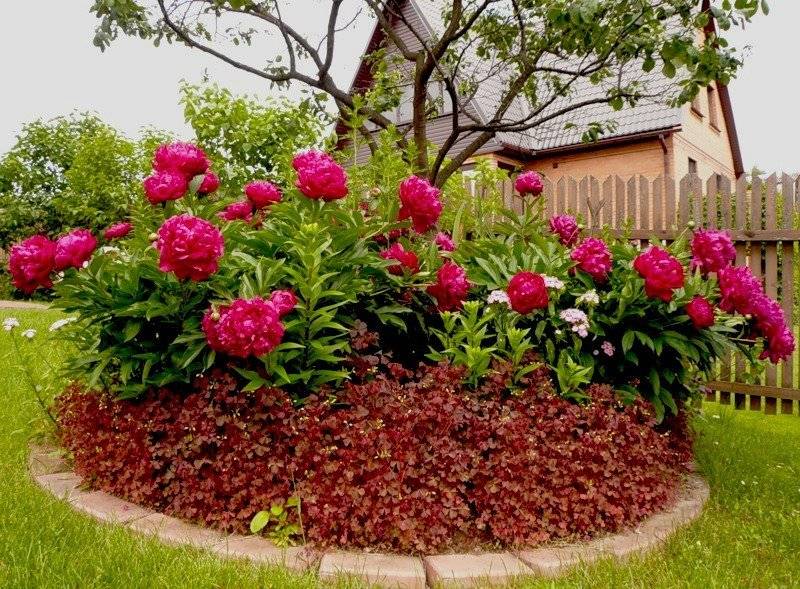 Дори при правилния избор на сортове цветя, цветното легло ще изглежда окаяно, ако цветовата схема е неправилно избрана. Когато избирате божури в ярки бургундски нюанси, техните съседи трябва да бъдат червени цветя. Декоративните бели лъкове също са хармонично съчетани с тях. Кораловите и белите божури се допълват добре: