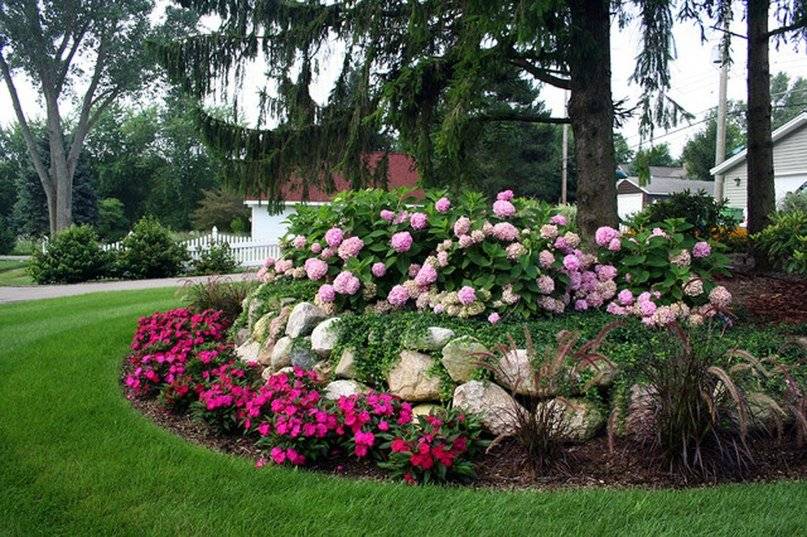 Многоетажният метод за оформяне на цветно легло се използва за големи пространства. Това ще ви позволи ефективно да комбинирате растения, които се различават по размер, форма, скорост на растеж и цвят.