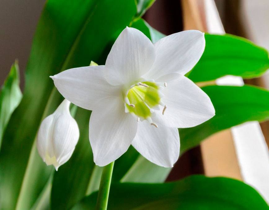 Отличен избор е еухарисът. Изящните му цветя външно приличат на нарцисите. Цъфтежът започва през есента, а когато приключи, eucharis радва окото с декоративна зеленина.