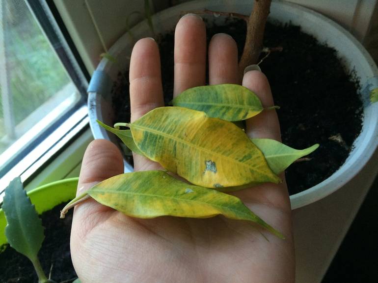 В допълнение към отпадането на долните листа, те също могат да се покрият с кафяви петна. Най-вероятно възниква гниене на кореновата шийка. Растението страда от гъбично заболяване, необходими са спешна фунгицидна обработка и санитарна резитба.