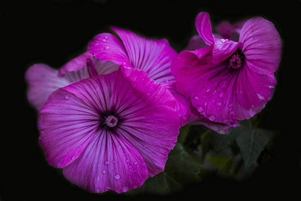 Лаватера с винено-лилави цветя, които придават специален обем от контрастни вени. Цветето изглежда много впечатляващо.