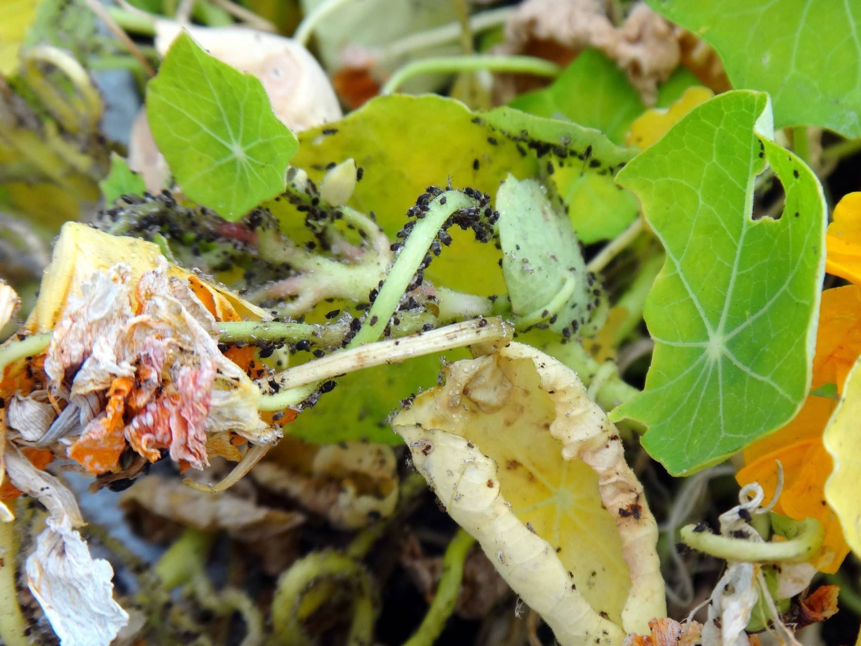 Най-опасни за настурцията са листни въшки, зелеви молци, паякови акари и бели. Листните въшки са особено опустошителни. Вредителят се установява от грешната страна на листа и изсмуква соковете. Скоро листът пожълтява и изсъхва. Ако не предприемете действия, цветето ще бъде унищожено след няколко дни. Обикновената пепел помага в борбата срещу листни въшки. След всеки дъжд трябва да се поръсва с растения.