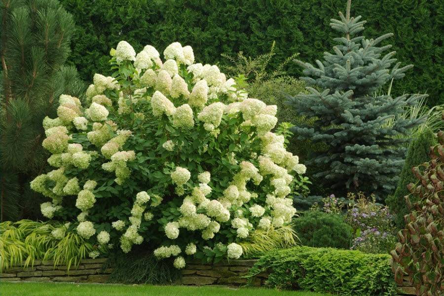 - Миксбордер с хортензия и иглолистни дървета