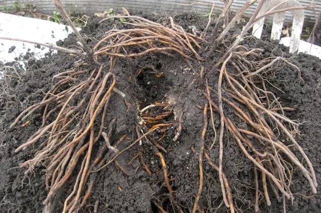 - Храстът се изкопава, отстъпвайки в кръг от основата на стъблата с 50 cm.