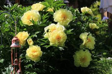 - Подхранване. Ако при засаждането на растението е било приложено достатъчно количество тор, подхранването не се извършва през първите години.Първото подхранване обикновено се извършва през пролетта през третата година след засаждането на храста. Необходимо е да вземете разтвор на лопен, можете също да добавите суперфосфат (20 g) към него. Втората необходима превръзка за цветя се извършва след цъфтежа в средата на юли, като се добавя фосфорно-калиево разтворим тор, тъй като се полагат пъпки, които осигуряват цъфтежа за следващата година. Можете също така да захранвате божури с дървесна пепел в размер на 300 г за всеки храст.