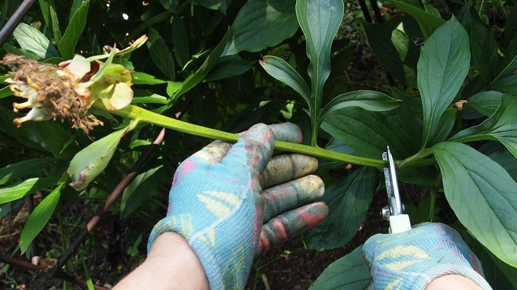 Избледнелите пъпки се изрязват с остър резач, оставяйки част от стъблата на храста. Наложително е да премахнете падналите листенца от земята около божура, в противен случай те ще се превърнат в дом за вредители и патогени.