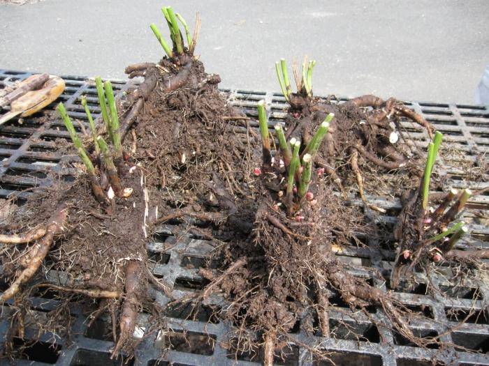 - Разделен е на части с до 3-5 живи пъпки и 3 адвентивни корена.