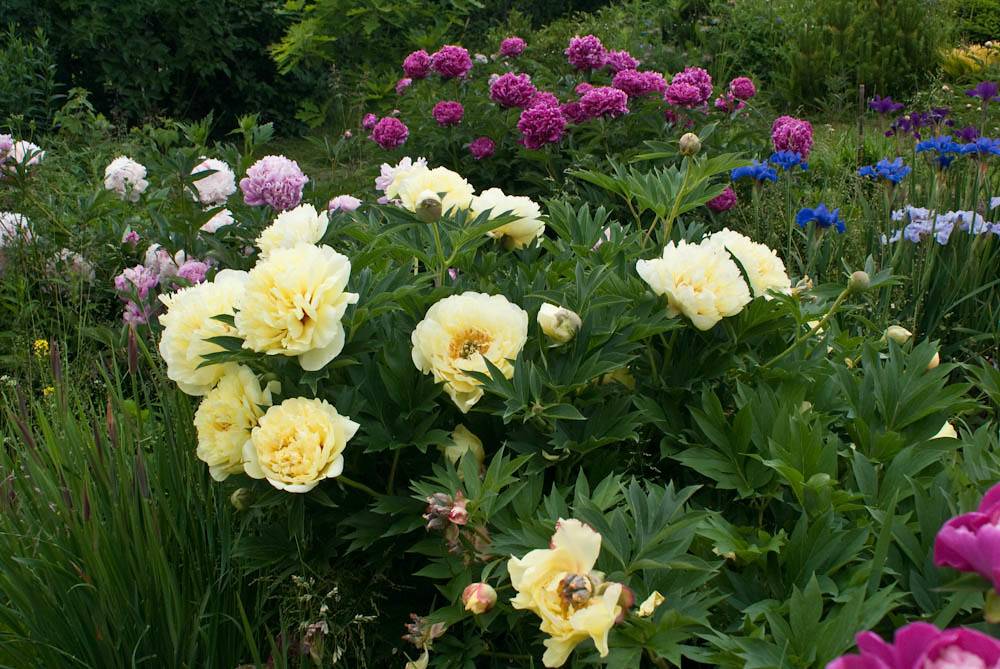 Бордюри и градински пътеки, облицовани с жълти божури, изглеждат добре. Сменяйки растенията-компаньони, можете да получавате нов дизайн всяка година.