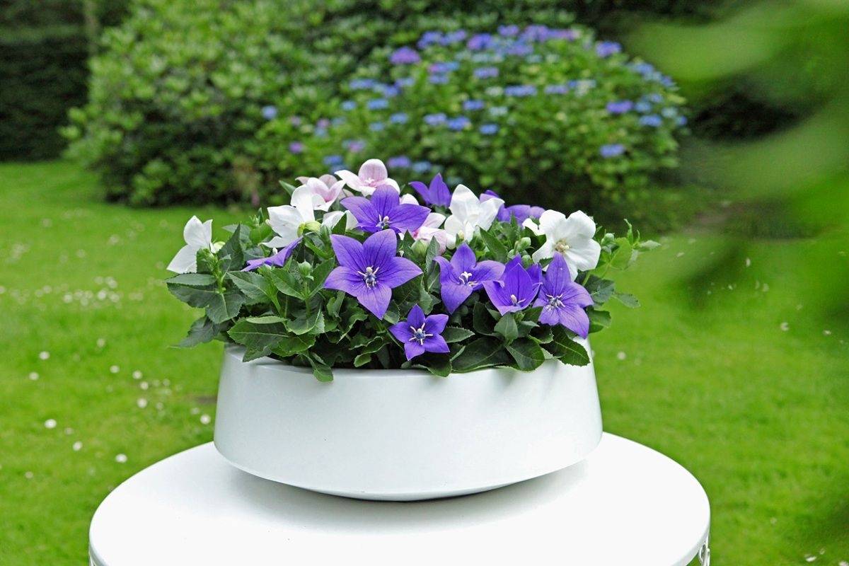 Можете да отидете и по другия начин: засадете платикодон в саксии или оградени цветни лехи. Такива миниатюрни композиции изглеждат не по-лоши от традиционните. Можете да засадите седем сорта в един контейнер, това ще ви позволи да комбинирате няколко цвята цветя.