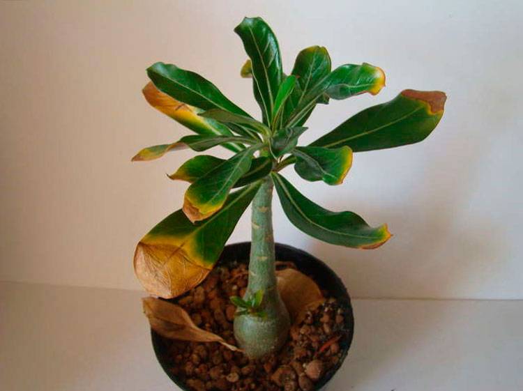 Най-често адениумът е засегнат от гниене и гъбички, които са резултат от неправилно поливане. И двете заболявания започват преди всичко да увреждат каудекса, който спира не само цъфтежа, но и развитието на храста като цяло: листата пожълтяват, пъпките падат, без да имат време да се образуват нормално.