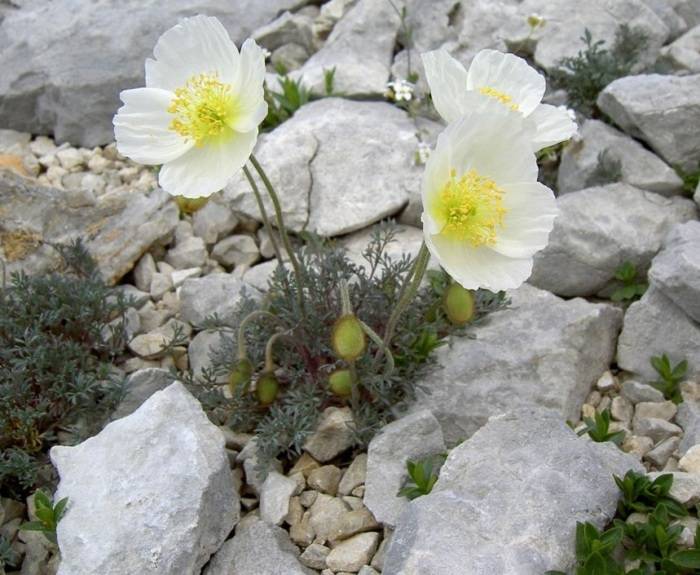 Papaver също се засажда върху алпийски пързалки. Простите сортове бяло, жълто или червено-оранжево изглеждат особено добре тук.