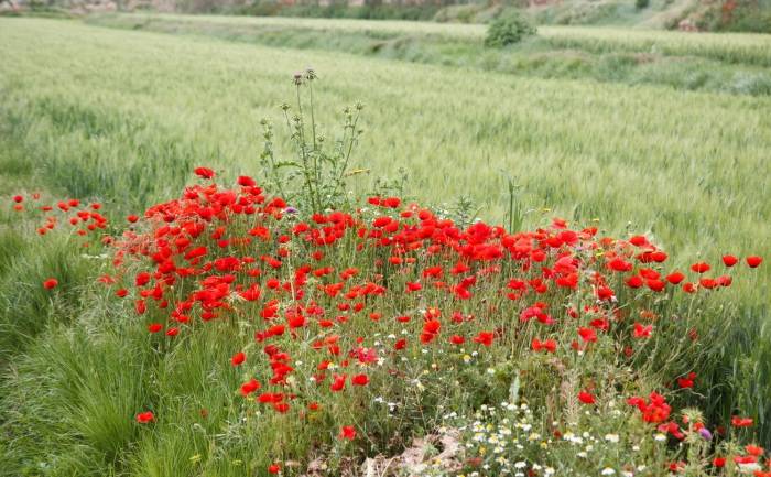- Ако искате да създадете парче лятно поле на сайта, тогава трябва да добавите зърнени култури (например перна трева) към папавера, както и естествените съседи на мака - метличина и маргаритки.