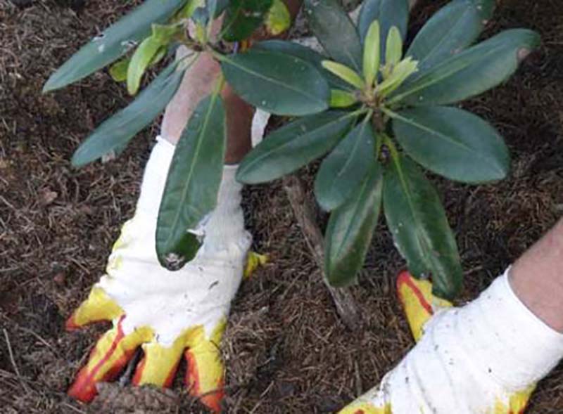 - Багажникът на рододендрона е обвързан с опората.