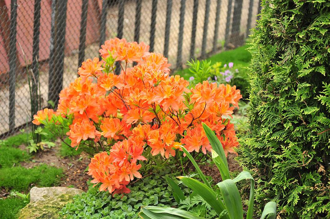 Японският рододендрон е разработен за региони с ниски температури. Храстът е висок до 1,5 м. Издънките са гъсто разположени. Започва да цъфти в средата на май. Пъпките са големи, светлооранжеви.