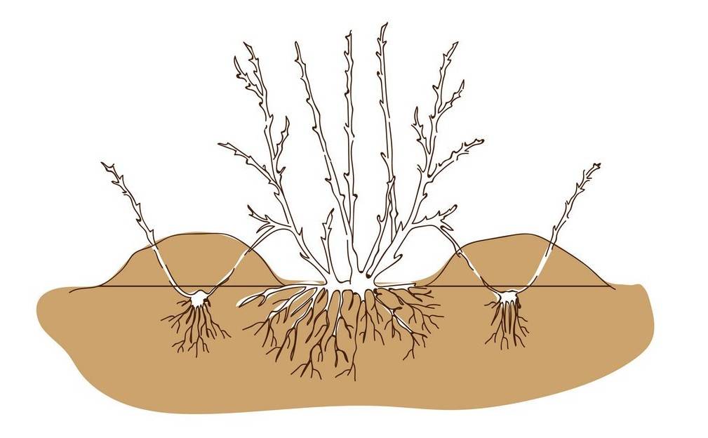Друг добър начин е вкореняването на резниците. Избира се силно дъно, което се поставя в плитък жлеб в почвата. За да се предотврати изправянето на клона, той трябва да бъде прикован към земята на няколко места. Корените остават непокътнати под храста до следващата пролет.