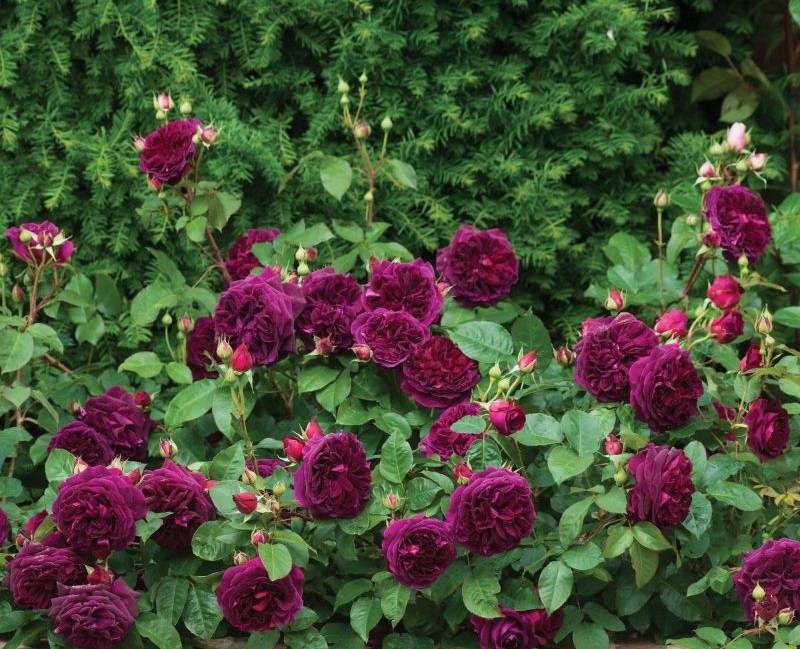 Бушът е компактен, максималната му височина и ширина рядко надвишават 1 метър. Клоните са покрити с яркозелени листа, които при излизане от пъпките имат бронзово-червен оттенък. Плътните пъпки, съставени от 75 венчелистчета, са червени преди отваряне. Цъфнало цвете с диаметър 10 см наподобява широка купа, боядисана в кадифен наситено бургундски цвят. Ароматът е силен, плодов, с подчертани нотки на боровинки и тръни.