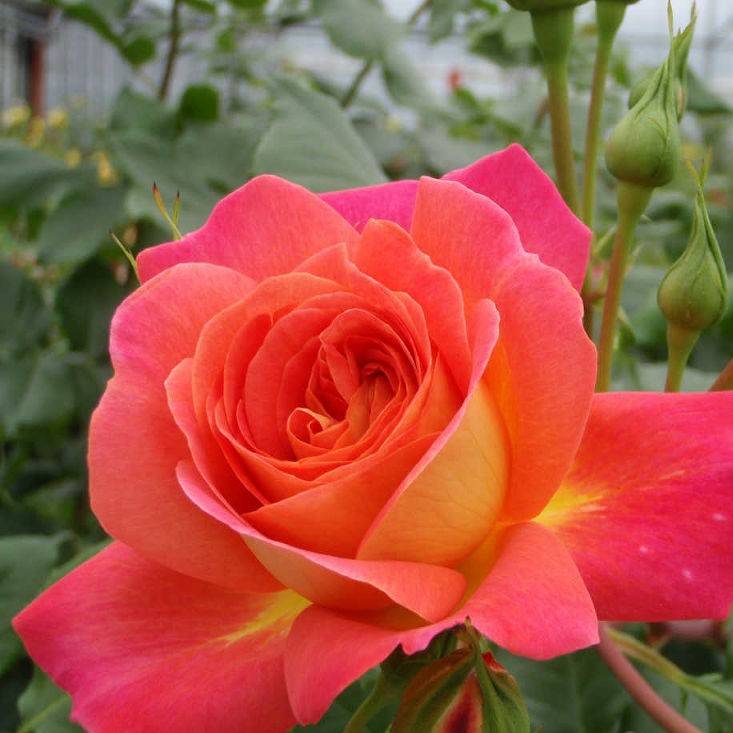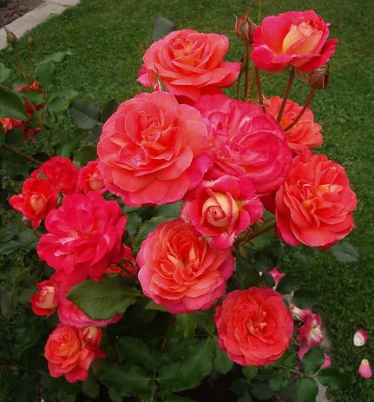 Растението цъфти от началото на юни до края на октомври. Красивите двойни цветя са с размер 5-8 см. Розата от този сорт се отличава с ярки жълто-червено-оранжеви нюанси. Центърът на цветето се издига над краищата на алено, пурпурно, черешово или розово. Вътрешността на розата има златист или кремав цвят. Пъпките са оформени в съцветия от по 4-13 цвята. Пъпките са сферични или с форма на чаша. Всяко цвете има 30-40 листенца, те запазват добре формата си и не губят своята привлекателност.
