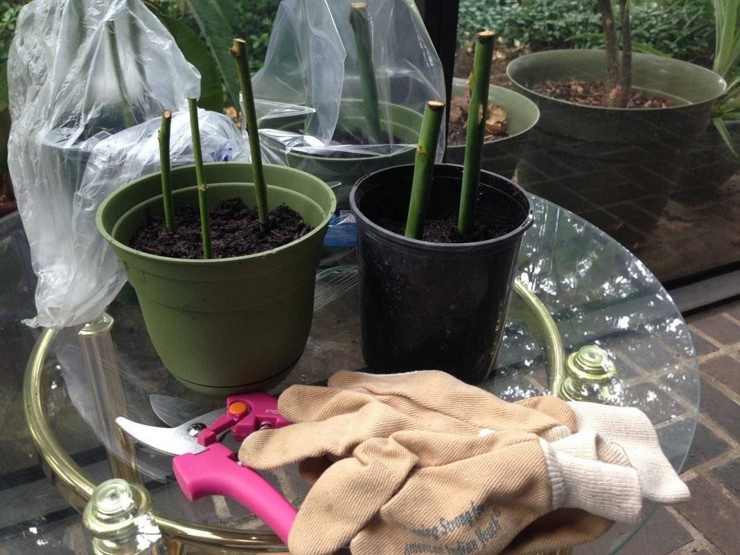 Сега най-важното е да се създадат благоприятни условия за вкореняване на резниците: саксията трябва да се постави в градината на сенчесто място, да се полива и да се напръсква със спрей всяка сутрин и вечер, като се поддържа влажността до 90%. Отворете капачката за 30 минути на ден, за да получите достъп до кислород и да предотвратите гниене.