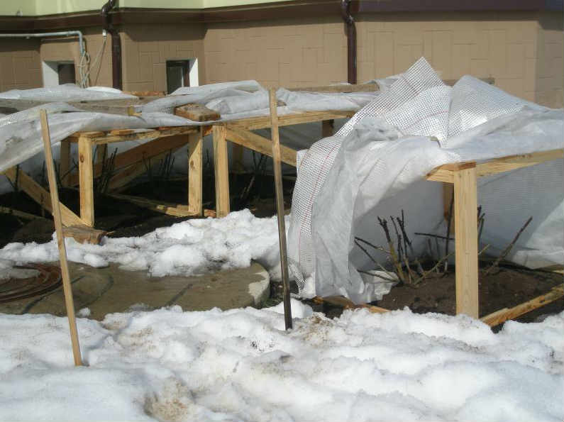 За да бъде по-удобно да се покрие растението, както и да се намали консумацията на покривен материал, се препоръчва да се извърши есенна резитба на цветето. След това кръгът около стъблото се вкопава внимателно, без да се увреждат корените и се покрива със суха зеленина или покрива със смърчови клони. Над розата се прави и изкуствен заслон. За да направите това, трябва да изградите рамка или капачка около растението и да го покриете със специална тъкан (геотекстил, лутрасил и др.)