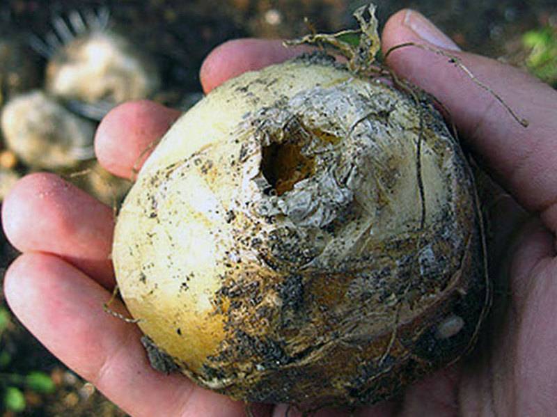 Понякога, когато съхранявате луковиците, може да забележите мокри петна, които потъват в самата тъкан. Тази гъба фузарум е повредила луковиците. Всички повредени материали трябва да бъдат унищожени, останалите луковици трябва да бъдат третирани с разтвор на лекарството флудиоксонил и засадени на мястото.