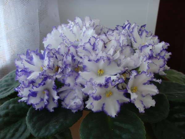 Синьо-бялата виолетова има звездовиден и полу-двоен вид. Розетката със стандартен размер има голяма зеленина и големи цветя. Те са двуцветни - бели със синкава граница.