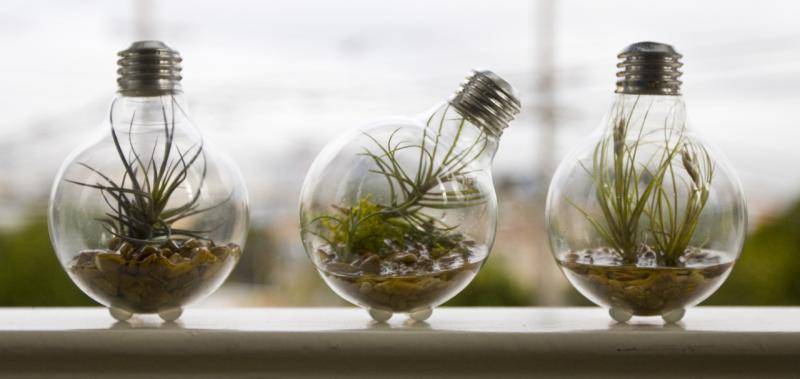 Атмосферните цветя не се нуждаят от пръст. Те трябва да вземат контейнер, стъкло или пластмаса, в който са направени няколко дупки за източване на водата.
