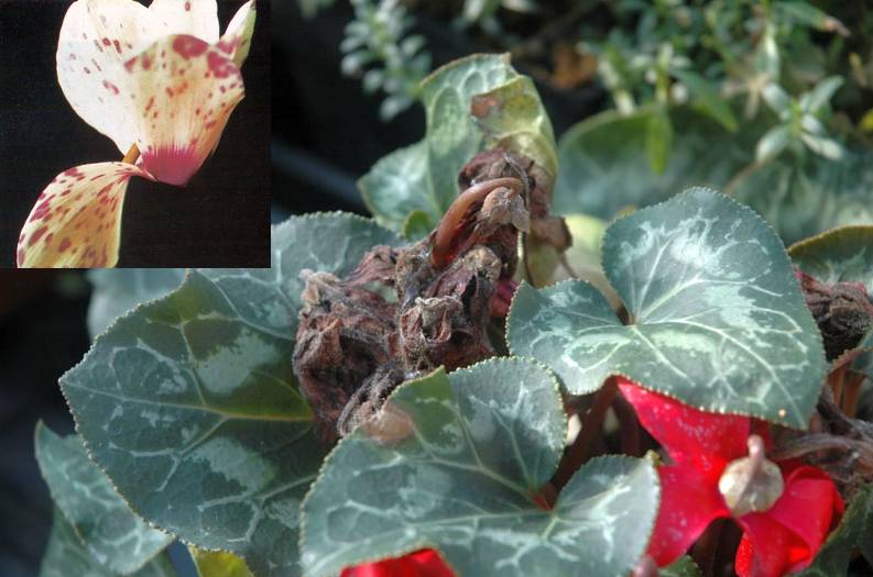Цикламата може да зарази следните вредители: циклама или ягодови акари, трипси, набраздени акари, листни въшки, нематоди. Растението е засегнато от болести като ръжда, черен крак, фузариум, гниене на корени и грудки.