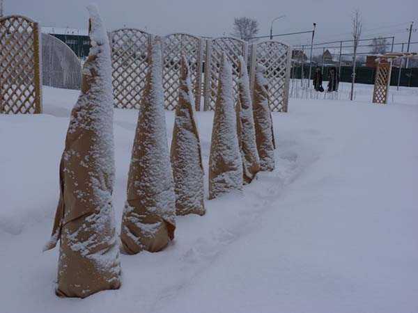 Зрелите храсти се нуждаят от сигурна рамка за зимуване. Основната цел на такива конструкции е да пазят короната от сняг, вятър и лед. Счупените клони не само развалят външния вид, те са запас от храна и влага. Това може да повлияе на състоянието на дървото след зимата.
